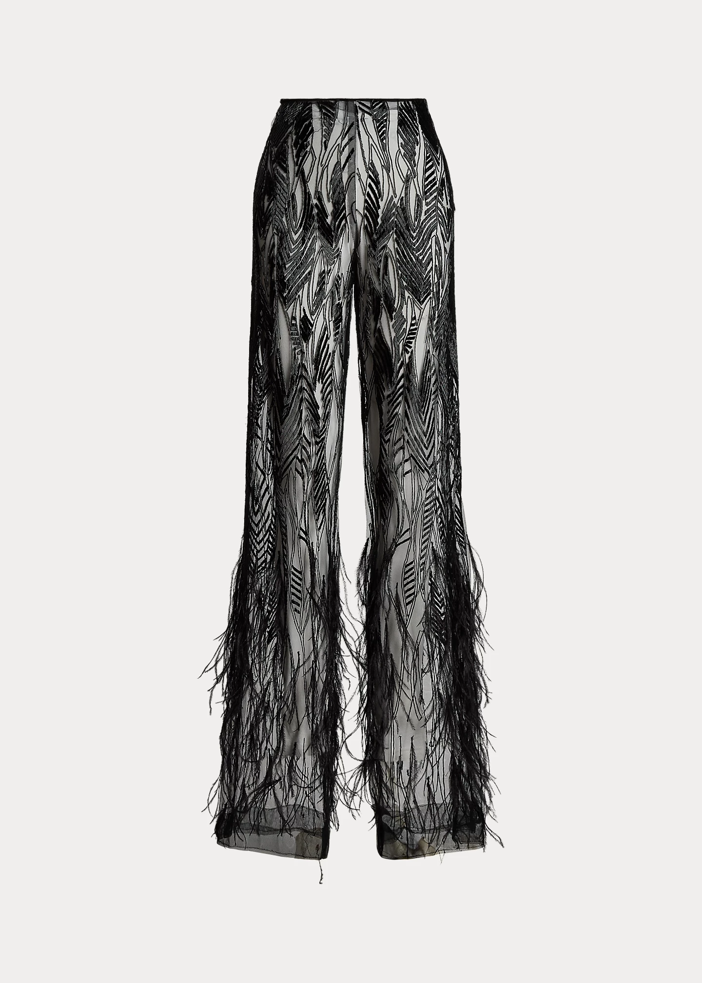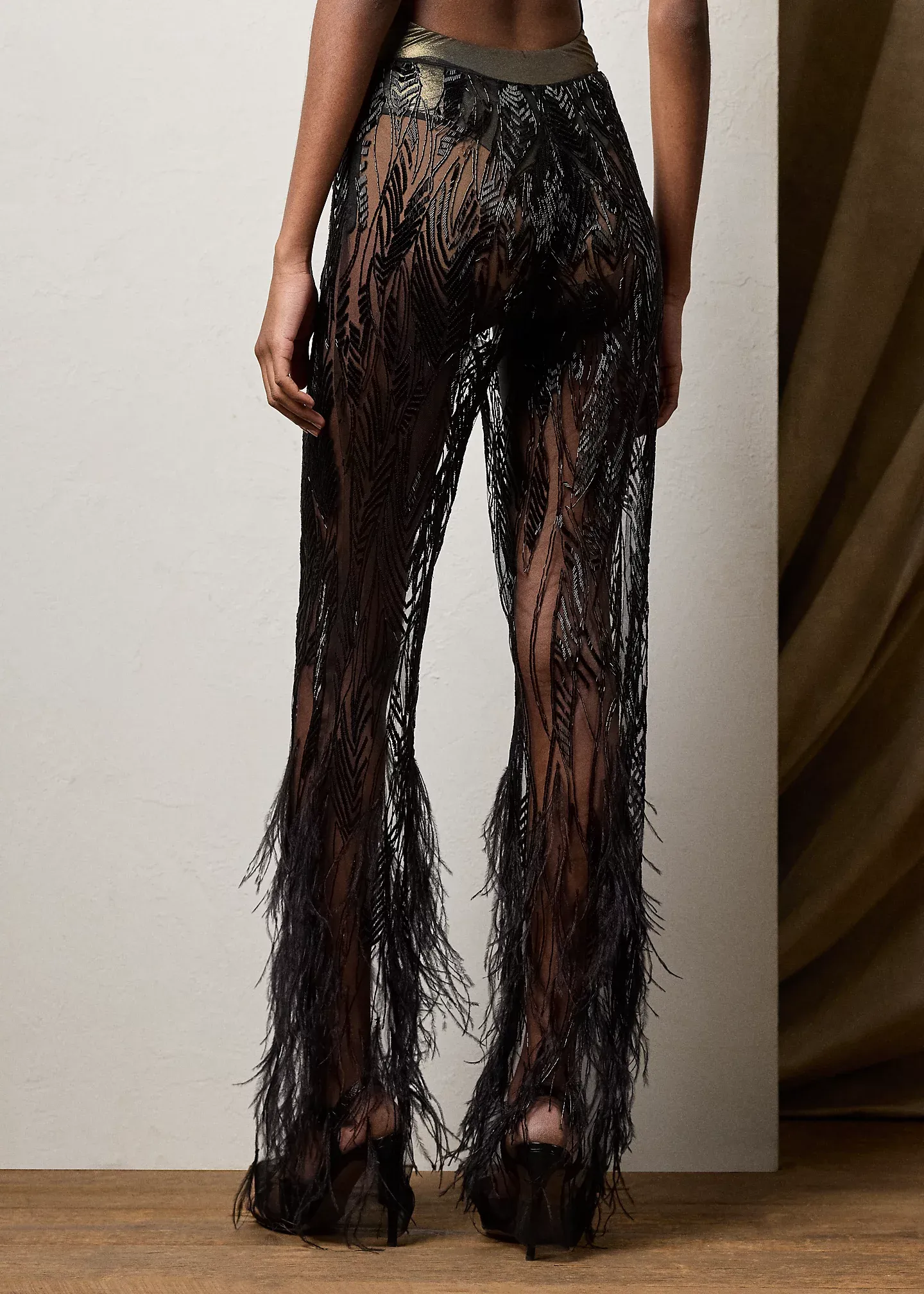 - Shell: 100% polyamide. Inner short: 93% viscose, 7% elastane. Decoration: 80% glass, 20% ostrich feathers.