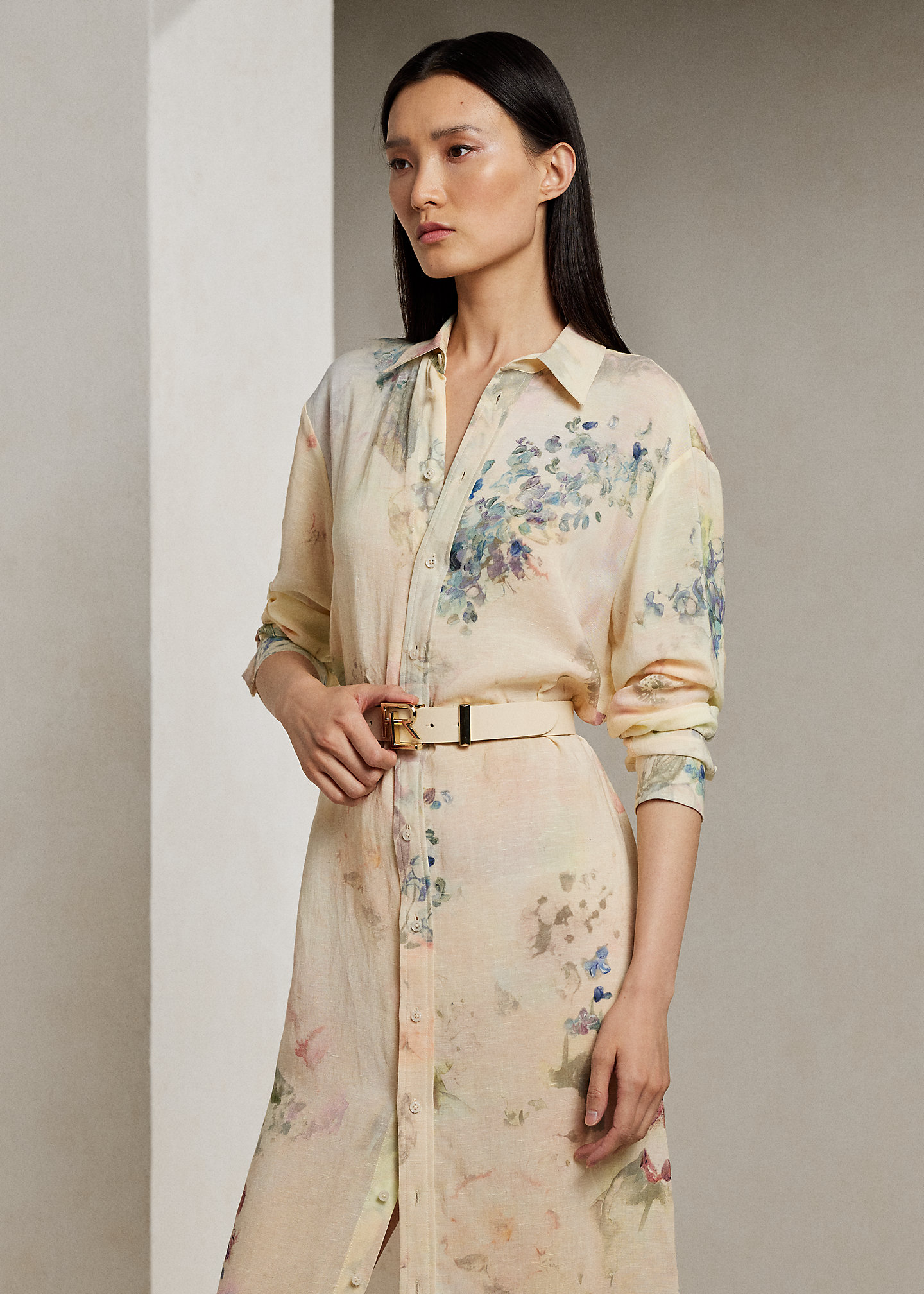 - Spread collar. Buttoned placket. Genuine mother-of-pearl buttons.