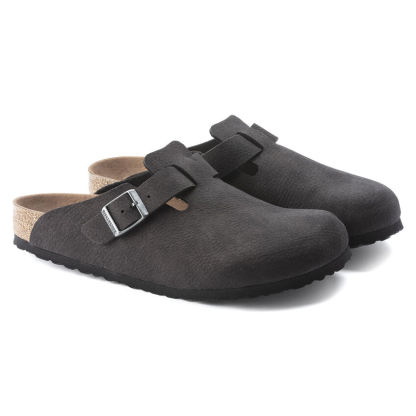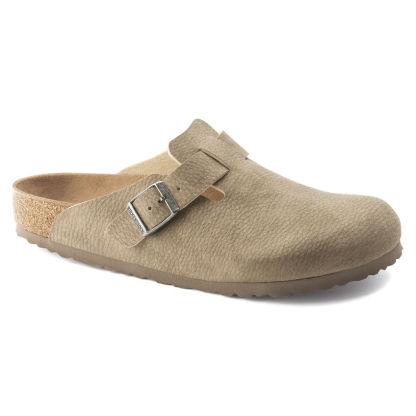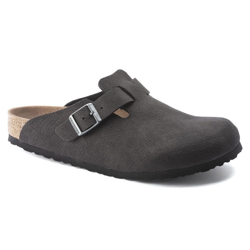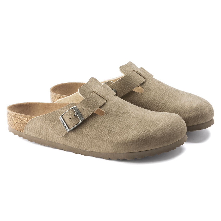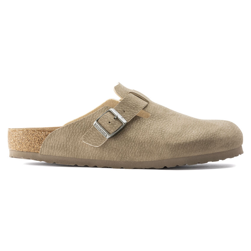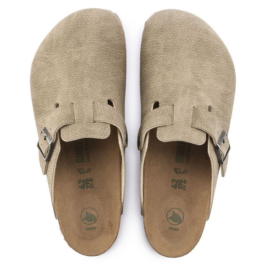 I sabot Birkenthtstock Boston sono un vero classico da indossare facilmente durante tutto l’anno. È stato prodotto con un materiale rinnovato ed è ora disponibile in versione vegan. Il modello viene inoltre sottoposto a controlli effettuati da laboratori indipendenti per garantire che non vi siano parti di origine animale. La tomaia è in microfibra delicata sulla pelle. Il gioco raffinato con i materiali conferisce ai sandali una finitura opaca che ricorda la venatura della pelle ma che è 100% vegan.