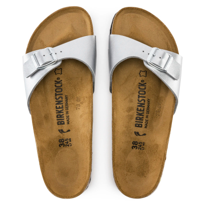 Birkenthtstock Madrid è il membro più anziano di questa famiglia di modelli e rimane sempre un grande classico. Lanciato mezzo secolo fa come “sandalo da ginnastica”, questo modello purista con un solo cinturino è diventato ormai una vera scarpa cult. Questa variante presenta un effetto glitter metallizzato. La tomaia è in Birko-Flor®, un materiale sintetico resistente all’usura e delicato per la pelle.